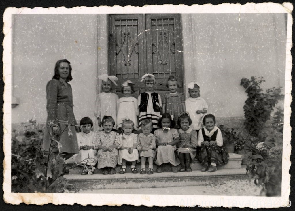 Gruppo di bambine dell'asilo, in posa insieme alla maestra.