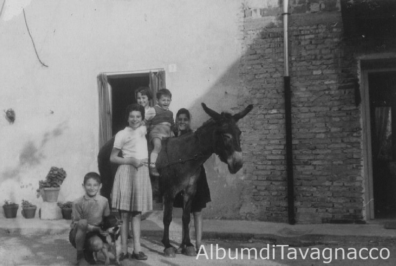 Gruppo di bambini in posa nel cortile insieme a un asino e un cane.
