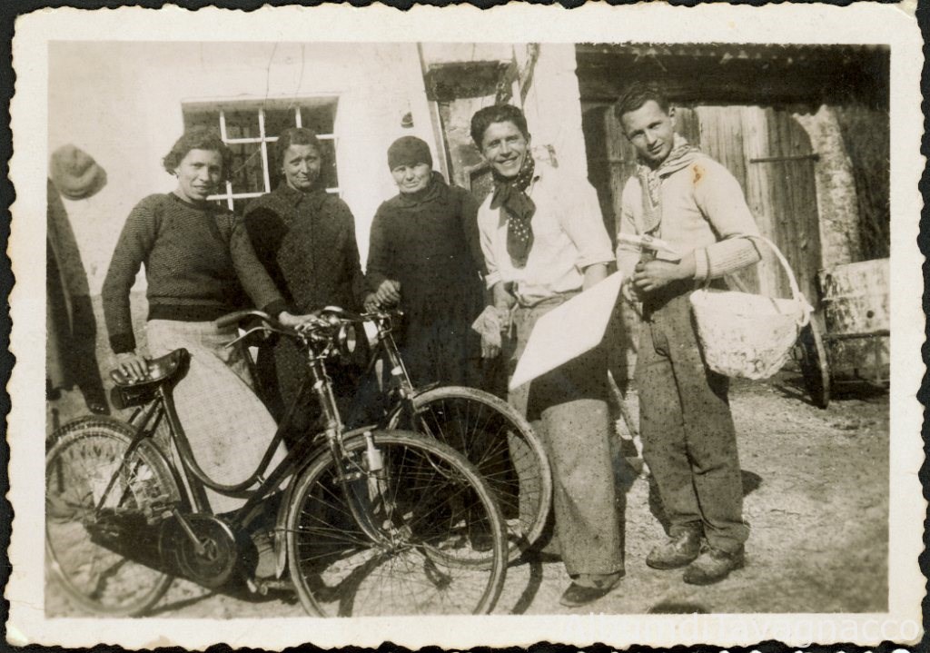 Gruppo di persone in posa nel cortile Foschiatti (Mantue): due uomini con attrezzi da lavoro edile, due donne con le biciclette e una donna anziana.