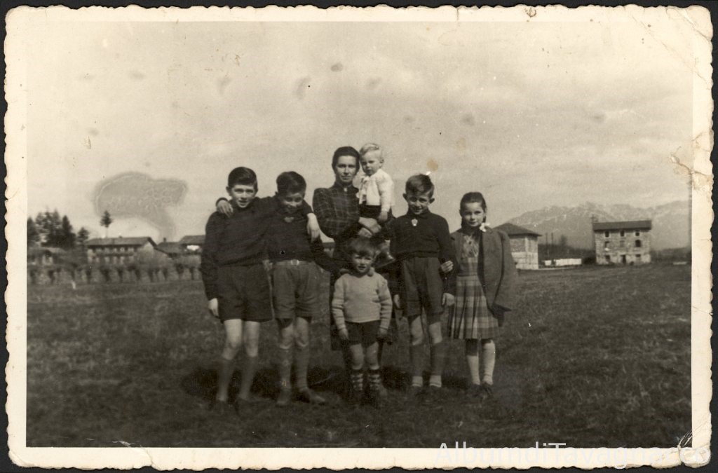 Bambini della famiglia Mansutti in posa, insieme alla Sig.a Mansutti, nei campi di Via Della Madonnina.