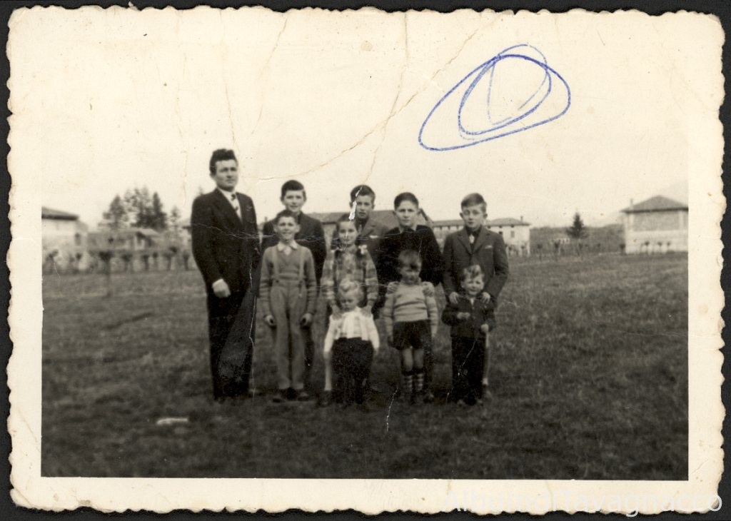 Gruppo della famiglia Mansutti, in posa su un campo, nei pressi di Via della Madonnina.
