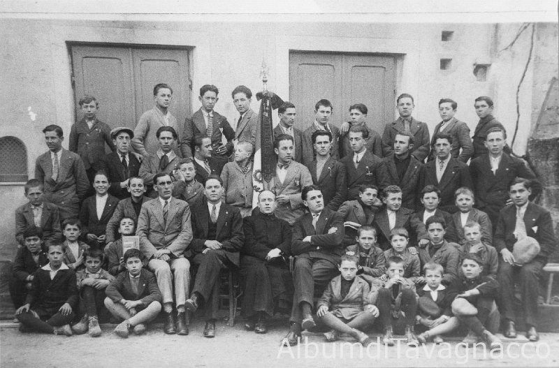 Gruppo maschile, probabilmente di una associazione, in posa con Don Eros Vegni (al centro).