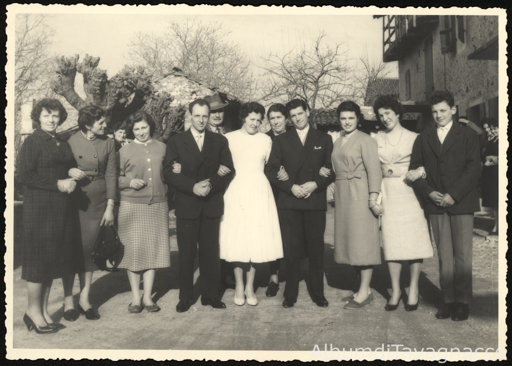 Gruppo nuziale in posa nel cortile di casa Beltrame in Via Cesare Battisti (oggi Via Damiano Chiesa), in occasione del matrimonio tra Giuseppe Colautti (4¦ da sx) e Rosina Beltrame (5^ da sx).