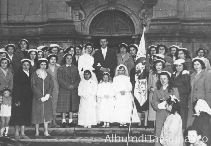 Gruppo femminile in posa con gli sposi ( prof. Bulfone e moglie) e le damigelle nuziali, sul sagrato della chiesa di S.Antonio Abate.