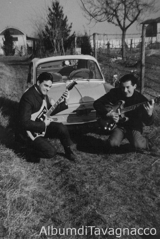 I fratelli Luciano e Claudio Coccolo in posa "musicale", con le chitarre elettriche, davanti all'autovettura "Bianchina", in una stradina fra gli orti.