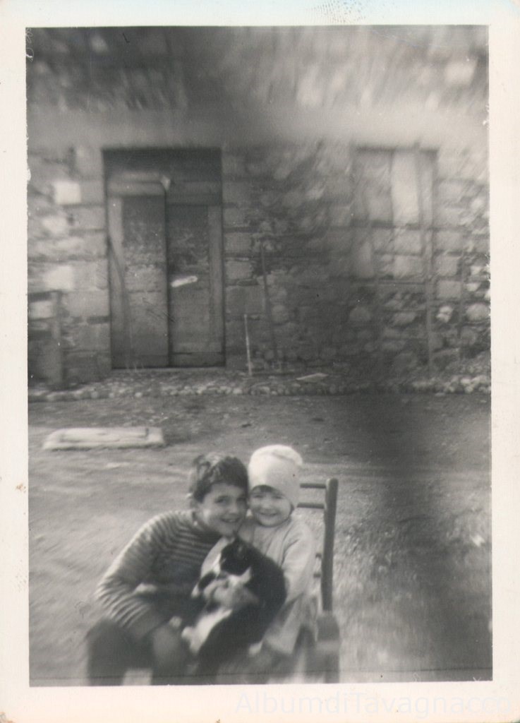 I fratelli Paolo e Agnese Pellarin, alle rispettive età apparenti di 6 e 3 anni, in posa insieme a un gatto nel cortile di casa Pellarin, in Via Canova 1.