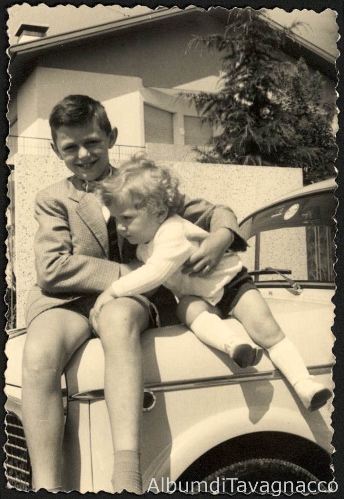 I fratellini Loris e Vanni Querini, sul cofano di un'automobile