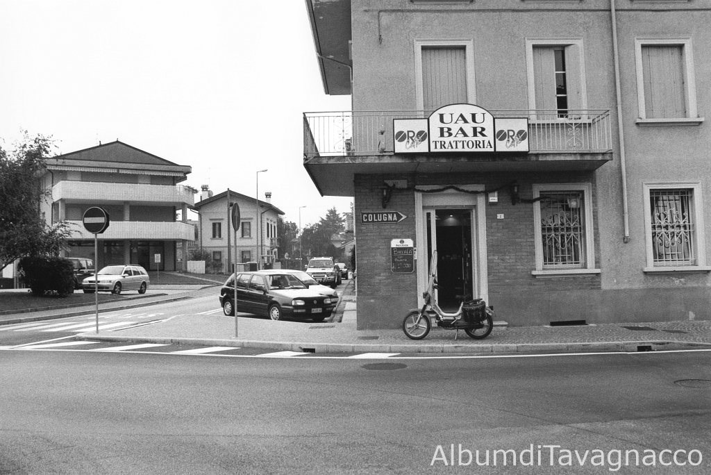 Via Colugna. - Incrocio. - Via A. Manzoni. - Cartelli stradali. - Bar: ‘Al Uàu’. - Insegne. - Tabella. - Automobili. - Motocicletta