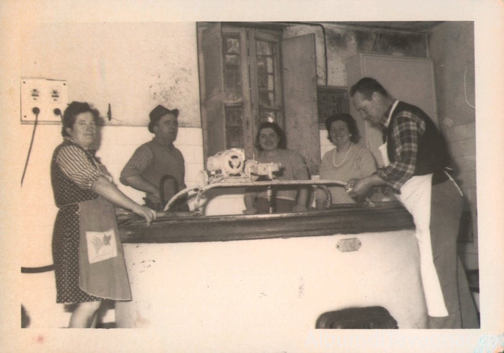 Il casaro Angelo Della Mora, in compagnia di altre persone, ripreso durante la lavorazione del formaggio, all'interno della latteria di Cavalicco.