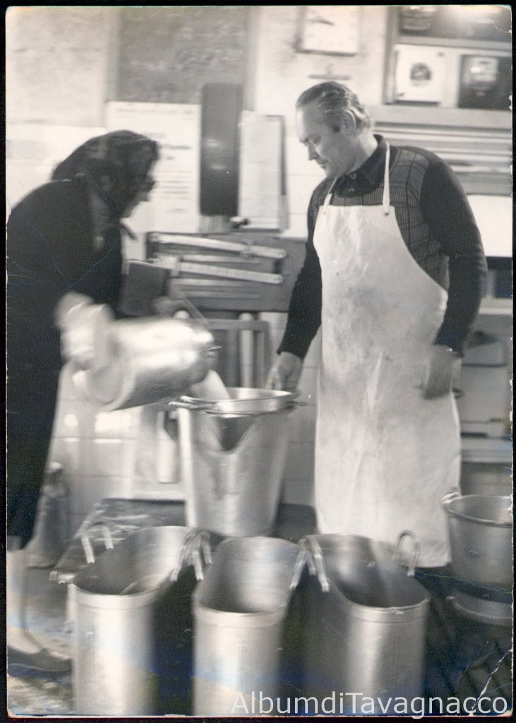 Il casaro Angelo Della Mora, ritratto nel reparto pesatura della latteria di Cavalicco, insieme a una donna che versa il latte in un secchio posto sul piano della bilancia.