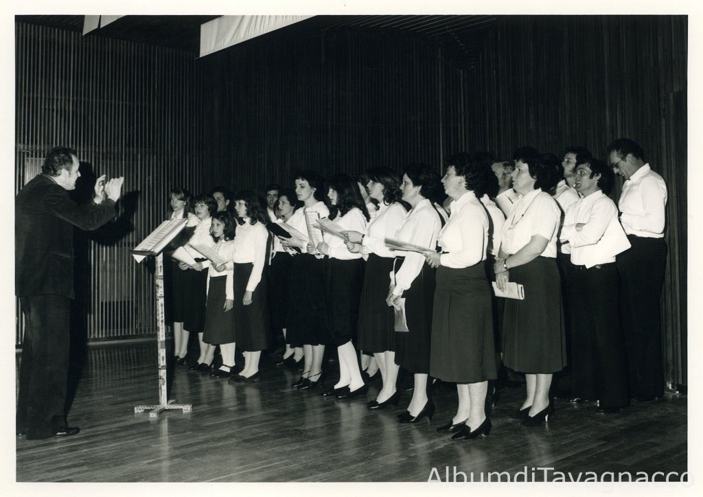 Concerto di vari gruppi corali. Il coro di Colugna, diretto da Don Pasquale Pressacco, sul palco dell’auditorium.