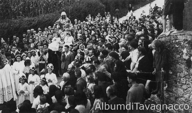 Il corteo della processione accompagna la statua della Madonna lungo una via del paese.