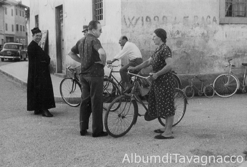 Il parroco, Don Nicolò Rossi, in Piazza Libertà e Albe Bulfon (con la bicicletta) che dialoga con un uomo, sull'angolo con Via Cavallotti.