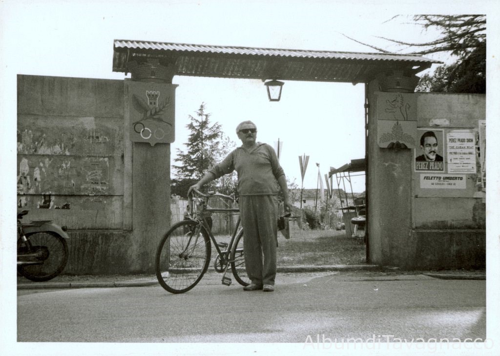 Ritratto del pittore Innocenzo Coccolo, in posa con la bicicletta, davanti all'ingresso della sagra di Feletto.