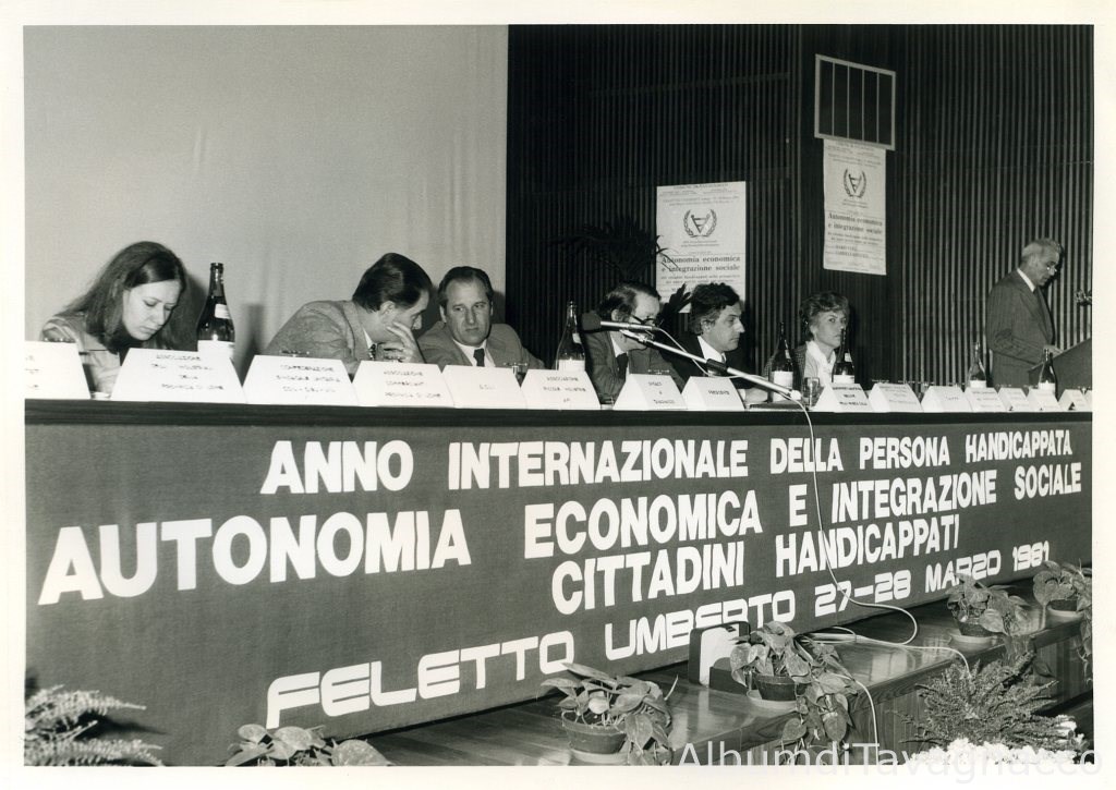 L’intervento del Preside delle scuole medie, prof. Giuseppe Mione, sul palco dell’auditorium a fianco delle autorità politiche e dei rappresentanti di varie associazioni e istituzioni, in occasione della Conferenza sull’autonomia economica e integrazione sociale dei cittadini handicappati.