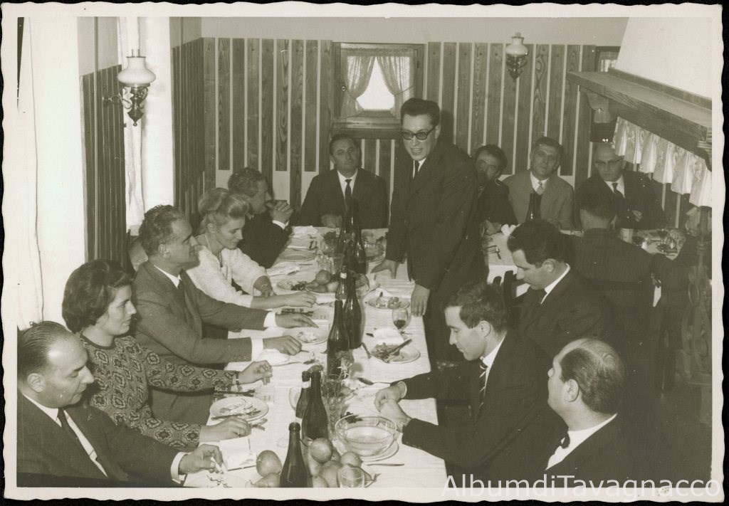 Tavolata di un gruppo di amici a cena nella trattoria "Al Fogolar", fotografata nel momento del discorso del prof. Giannino Angeli (in piedi, al centro).