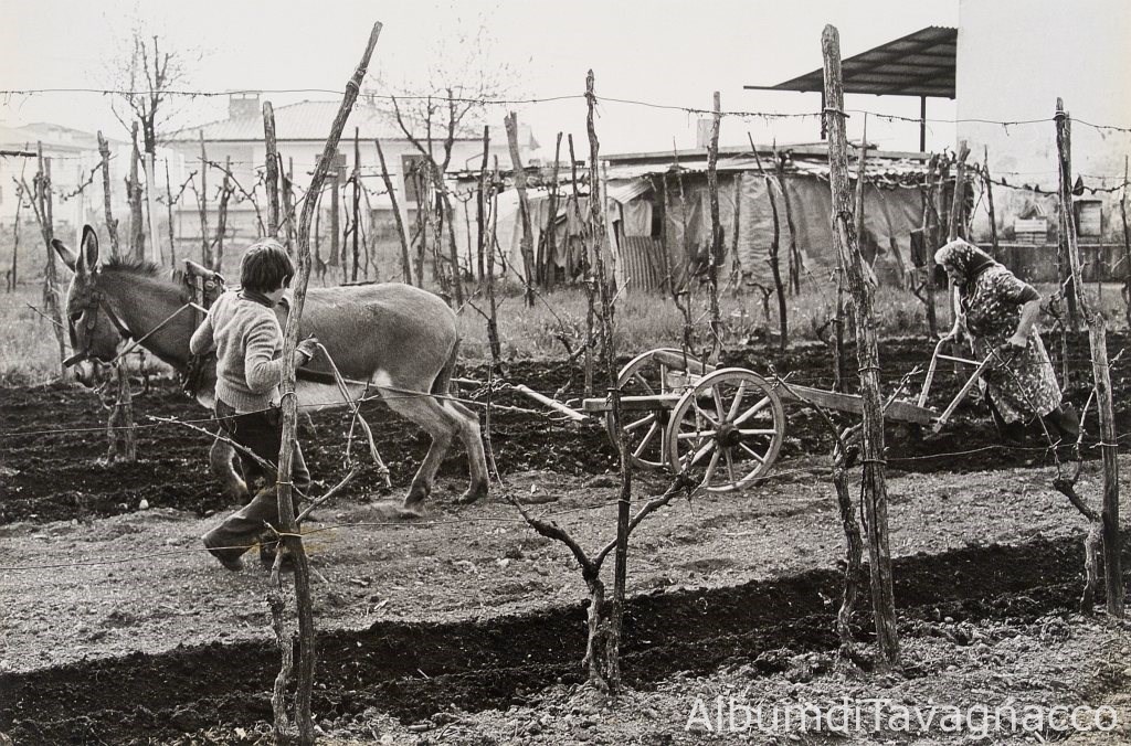 Scena di tradizionale agricoltura domestica: un’anziana donna ara il terreno di un vigneto, mentre il nipote dirige l’asino che trascina l’aratro.