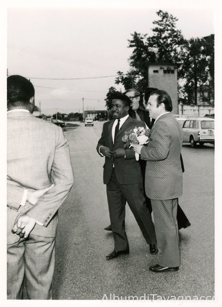 Il vicepresidente del Gabon, Léon Mébiame (al centro), in Via Padova, davanti all’ingresso della Ditta Freud Pozzo insieme a varie personalità, in occasione della visita ufficiale al Comune di Tavagnacco.