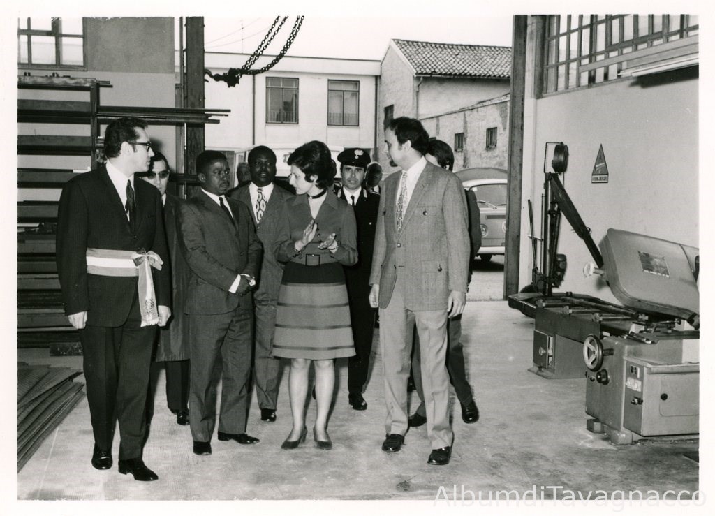 Il vicepresidente del Gabon, Léon Mébiame (al centro), all’interno della Ditta Freud Pozzo insieme al Sindaco Giannino Angeli, a Gianfranco Pozzo e a varie personalità, in occasione della visita ufficiale al Comune di Tavagnacco.