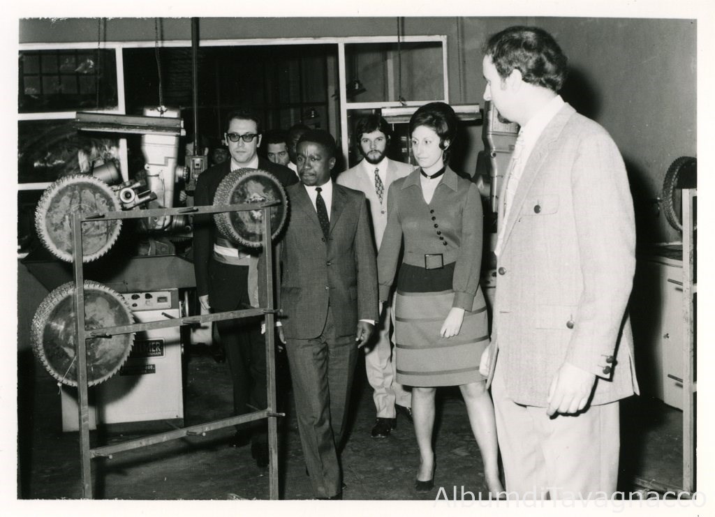Il vicepresidente del Gabon, Léon Mébiame (al centro), all’interno della Ditta Freud Pozzo insieme a Gianfranco Pozzo, al sindaco Giannino Angeli e a varie personalità, in occasione della visita ufficiale al Comune di Tavagnacco.