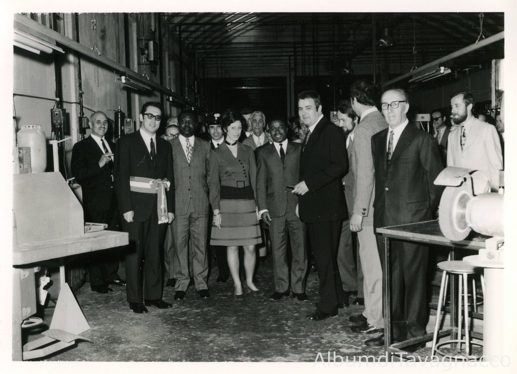 Il vicepresidente del Gabon, Léon Mébiame (al centro), in posa all’interno di un capannone della Ditta Freud Pozzo, insieme al Sindaco Giannino Angeli, ai fratelli Pozzo e a varie personalità della politica, delle istituzioni, del lavoro e della cultura, in occasione della visita ufficiale al Comune di Tavagnacco.