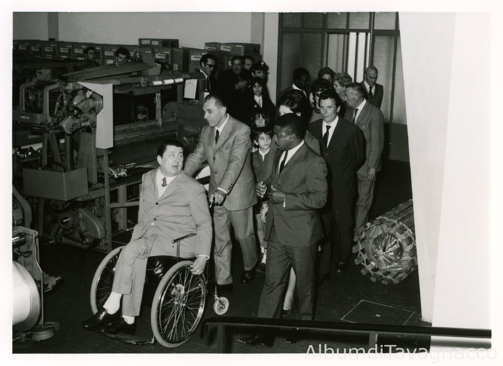 Il vicepresidente del Gabon, Léon Mébiame (al centro), all’interno della Manifattura Clede, dialoga con Giampaolo Clede alla testa di un gruppo composto da varie personalità della politica, delle istituzioni, del lavoro e della cultura, in occasione della visita ufficiale al Comune di Tavagnacco.