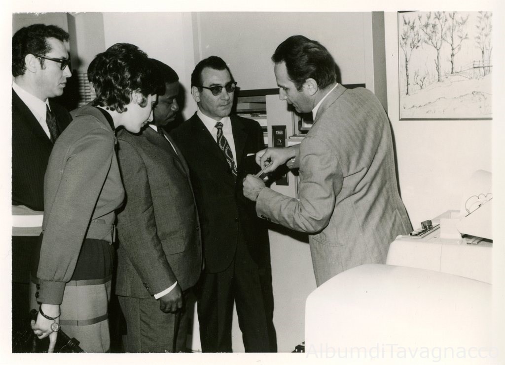 Il vicesegretario comunale, Mario D’Andrea, illustra, all’interno dell’ufficio anagrafe municipale, il funzionamento del sistema meccanografico al vicepresidente del Gabon, Léon Mébiame, in occasione della visita ufficiale al Comune di Tavagnacco.