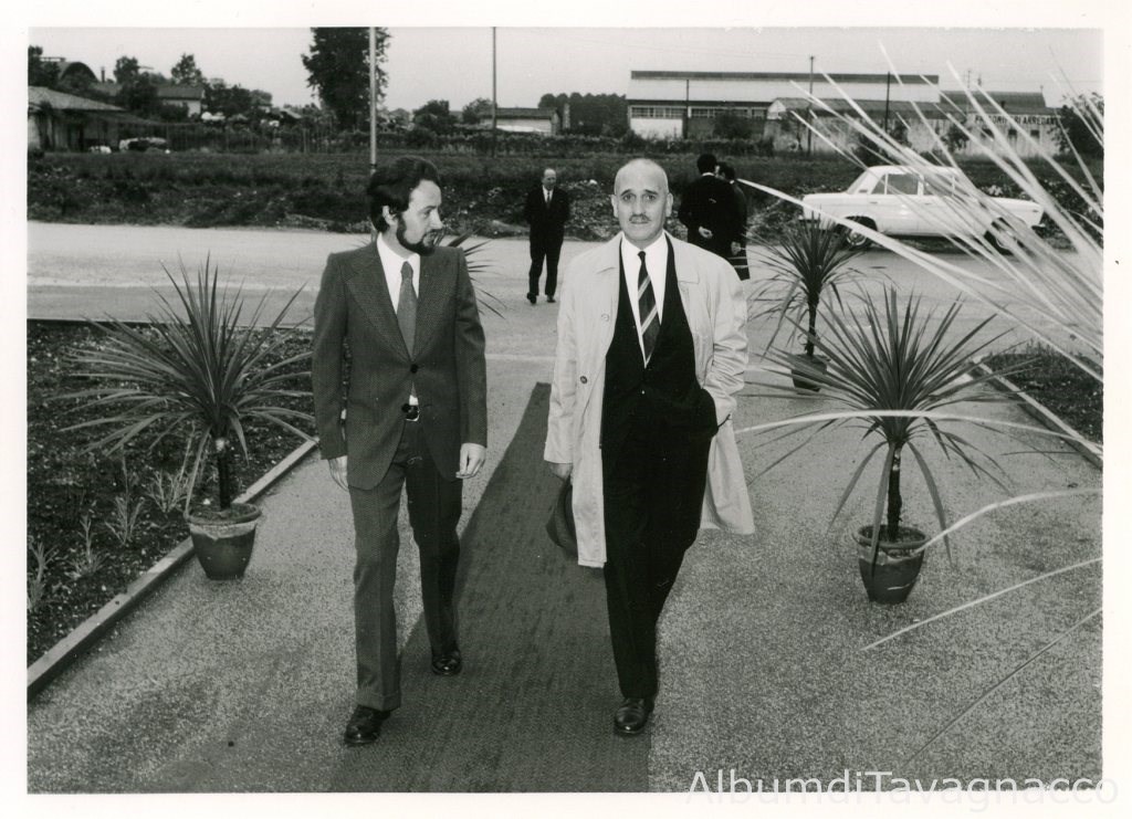 Giampaolo Pozzo (a sx) all’ingresso della Ditta Freud Pozzo insieme al Geom. Aurelio Cozzi (a dx) in attesa dell’arrivo del vicepresidente del Gabon, Léon Mébiame, in visita ufficiale al Comune di Tavagnacco.