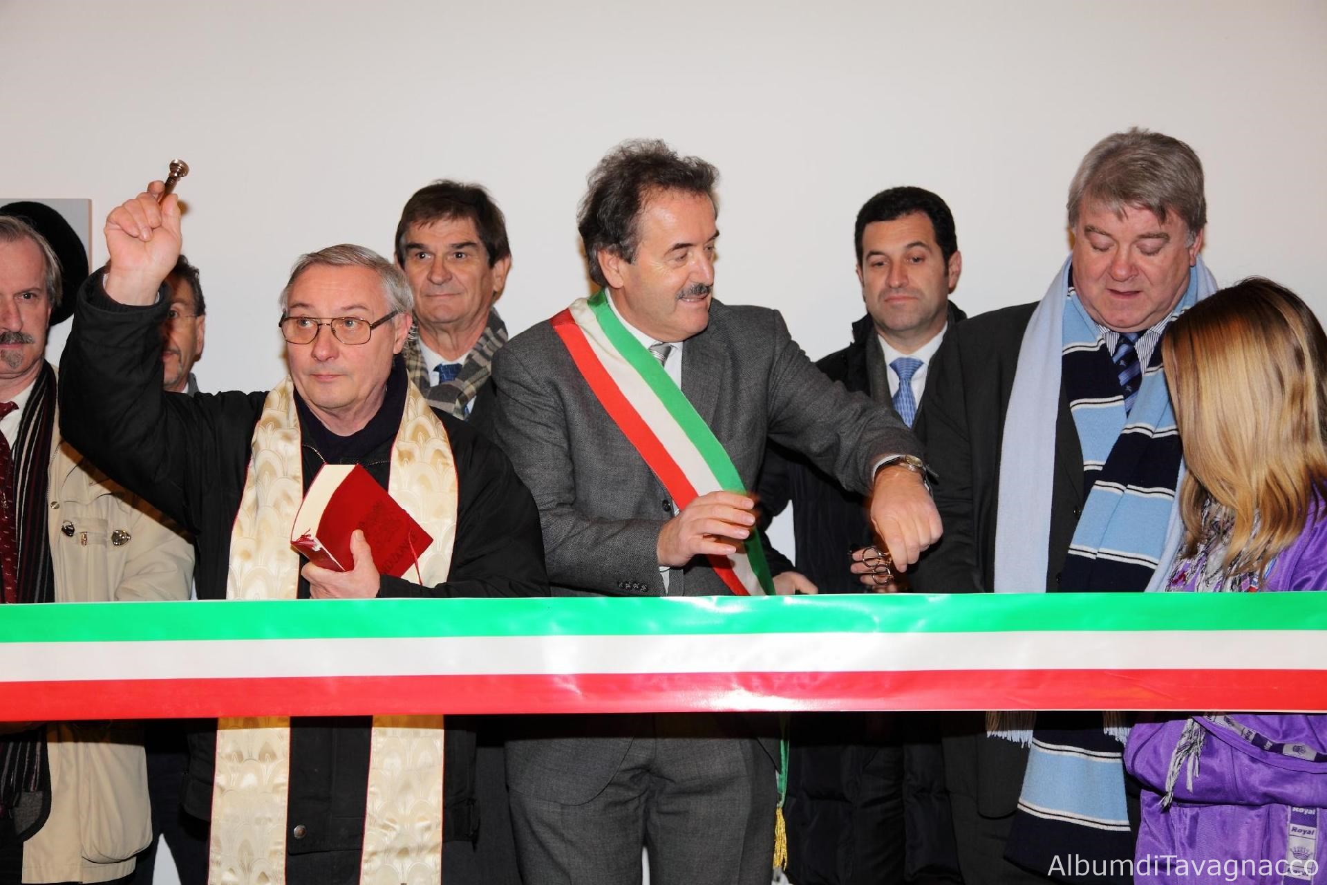 Il Sindaco di Reana Edi Colaoni, l'Assessore comunale ai Lavori Pubblici Di Piazza, il Parroco don Arrigo, il vicepresidente del CONI regionale Gemo, il Sindaco Pezzetta, il Presidente del Consiglio regionale Iacop e l'Assessore regionale allo sport De Anna durante il momento della benedizione in occasione dell'inaugurazione del Bocciodromo di Tavagnacco.