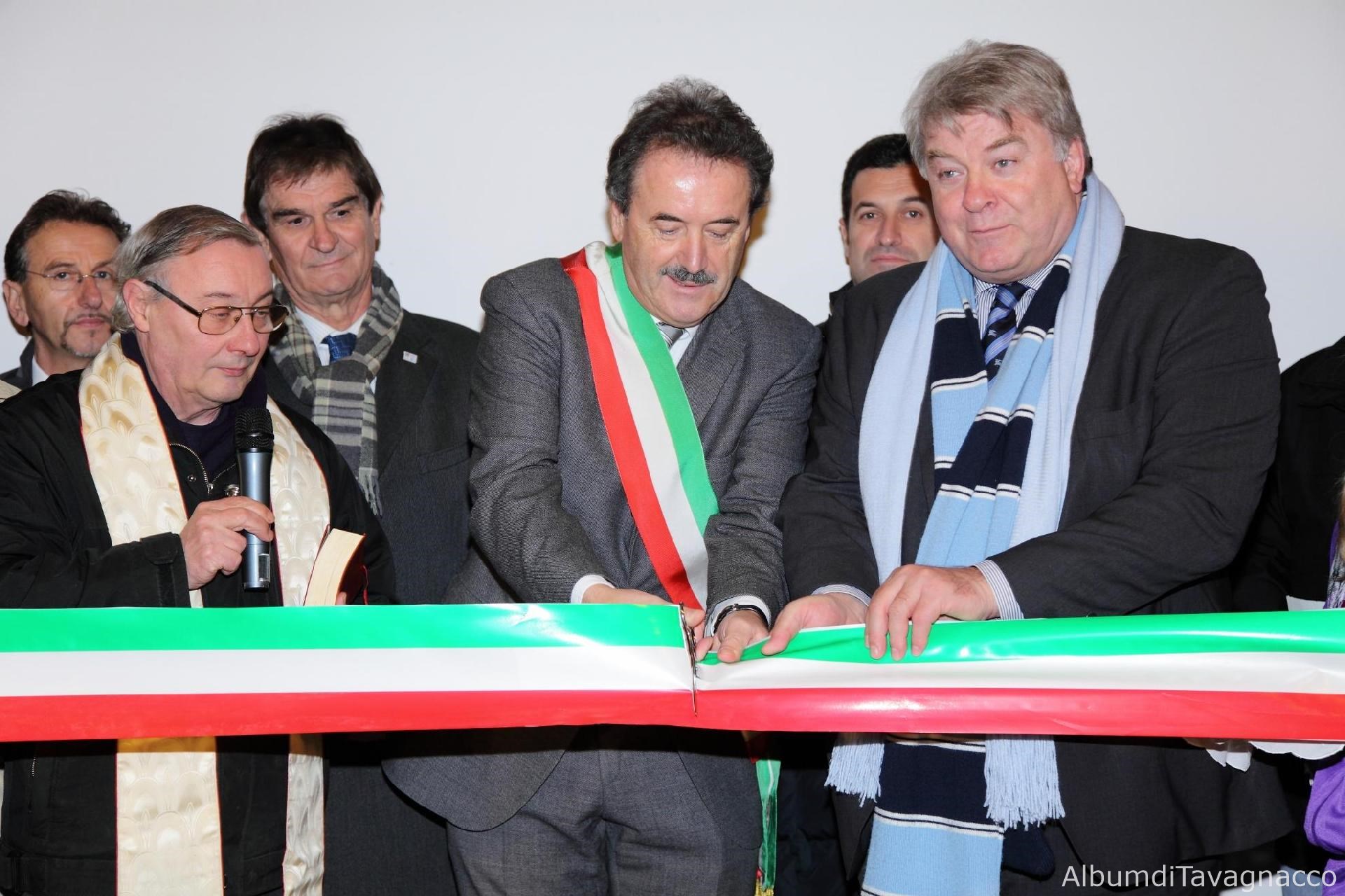 Il momento del taglio del nastro tricolore da parte del Sindaco Pezzetta alla presenza dell'Assessore comunale ai Lavori Pubblici Di Piazza, del Parroco don Arrigo, del vicepresidente del CONI regionale Gemo, del Presidente del Consiglio regionale Iacop e dell'Assessore regionale allo sport De Anna, in occasione dell'inaugurazione del Bocciodromo di Tavagnacco.
