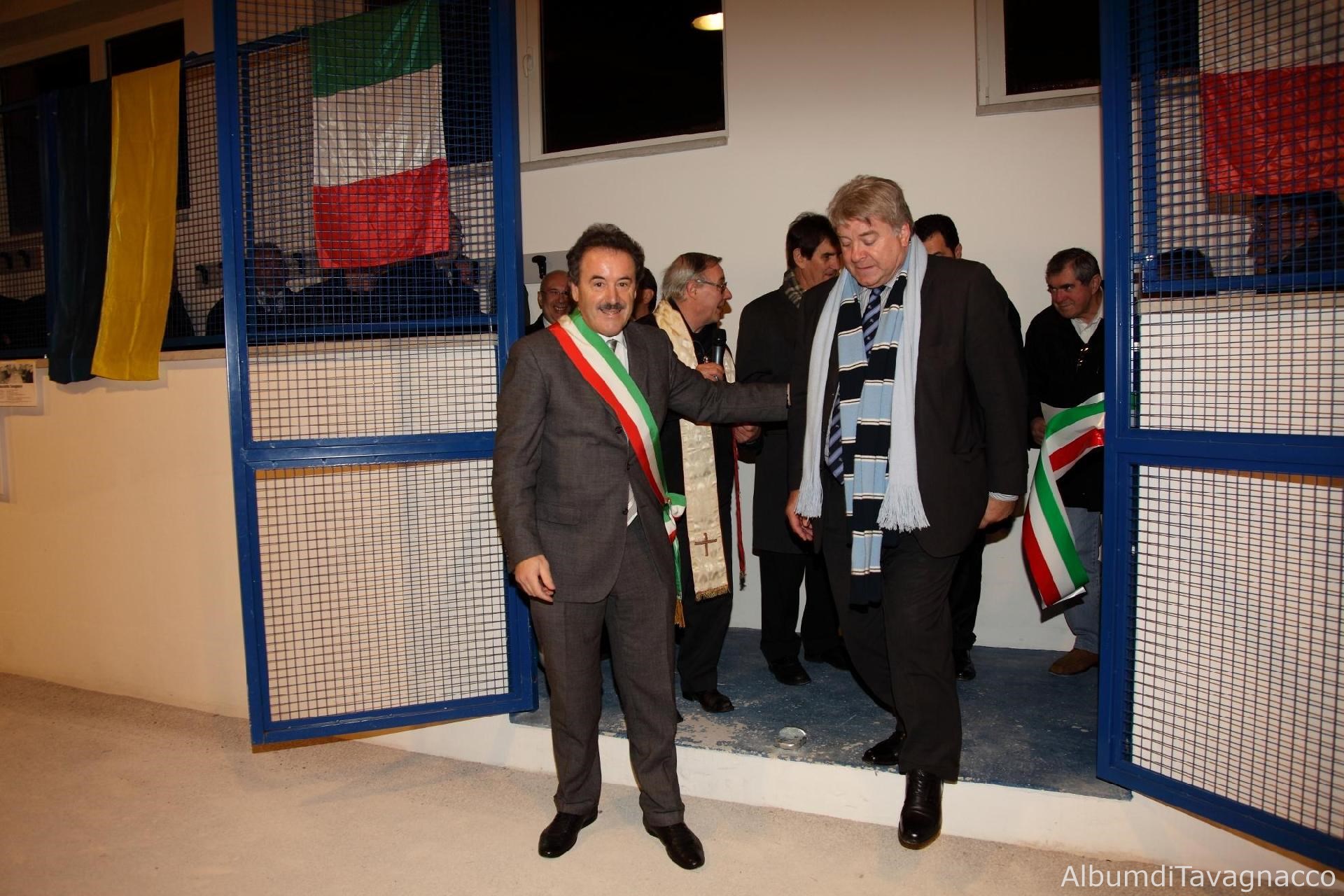 Il Sindaco Pezzetta, il Parroco don Arrigo, il vicepresidente del CONI regionale Gemo e l'Assessore regionale De Anna dopo il taglio del nastro tricolore in occasione dell'inaugurazione del Bocciodromo di Tavagnacco.
