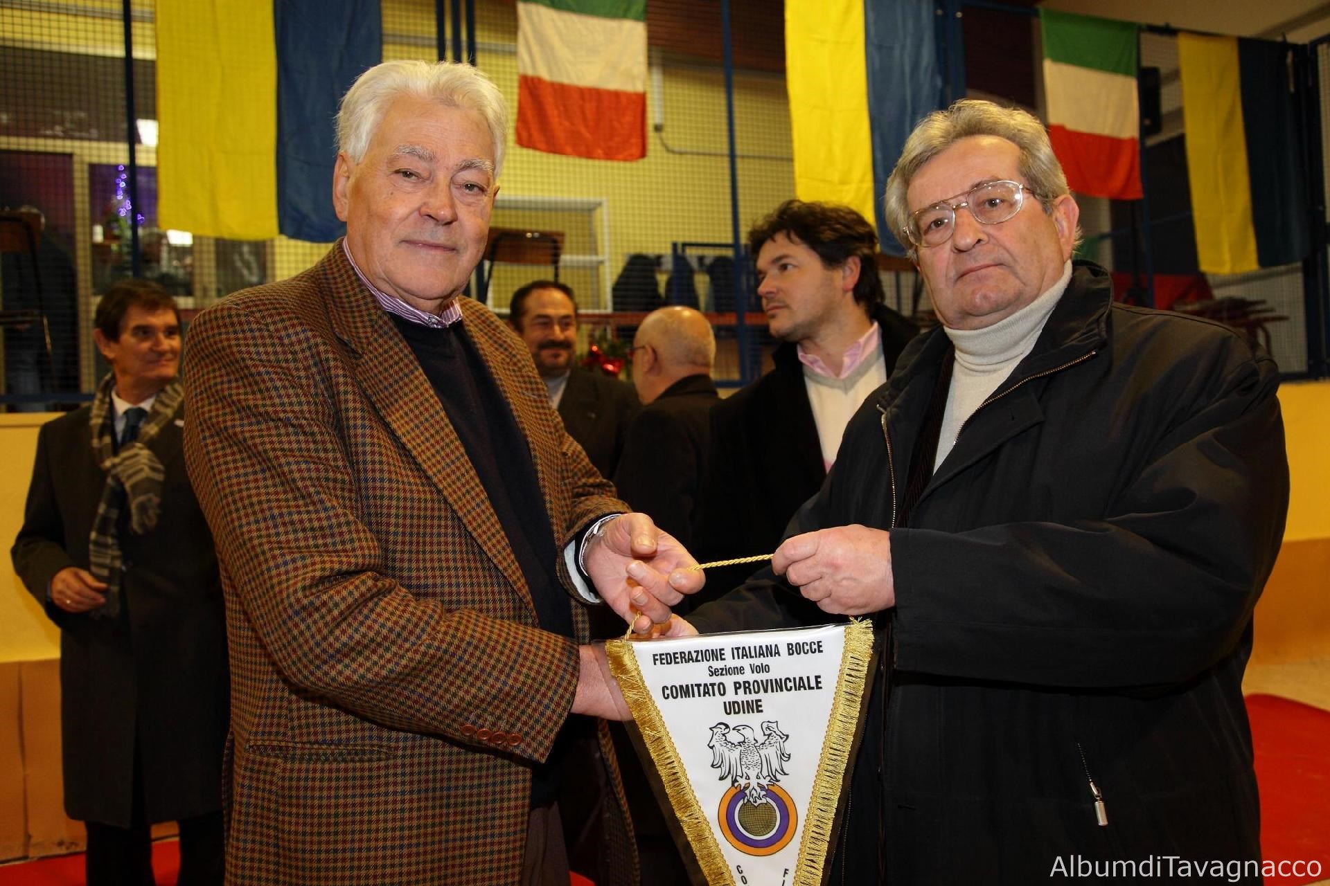 Il Presidente dell'Associazione Bocciofila di Tavagnacco Nespolo e il Presidente della Federbocce provinciale Lenisa con il gagliardetto della Federbocce provinciale di Udine in occasione della cerimonia di inaugurazione del Bocciodromo di Tavagnacco.