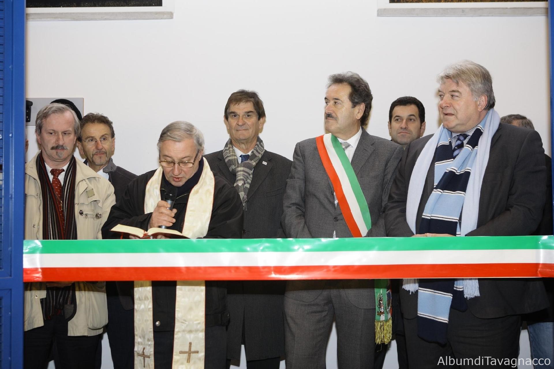 Il Sindaco di Reana del Rojale Colaoni, l'Assessore comunale ai Lavori Pubblici Di Piazza, il parroco di Tavagnacco don Arrigo, il vicepresidente del CONI regionale Gemo, il Sindaco Pezzetta, il Presidente del Consiglio regionale Iacop e l'Assessore regionale allo sport De Anna dietro al nastro tricolore durante l'inaugurazione del Bocciodromo di Tavagnacco.