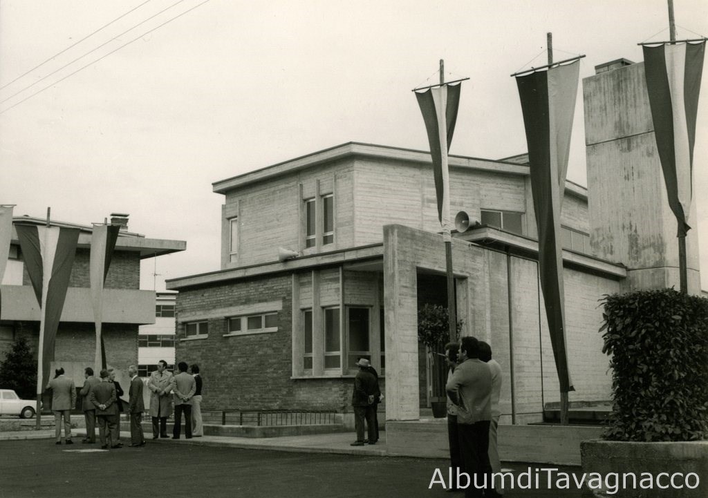 Il Poliambulatorio comunale, in Via Giuseppe Mazzini, nel giorno dell’inaugurazione. (Davanti all’ingresso un gruppo di persone tra cui il Sindaco Giannino Angeli, autorità e personalità locali)