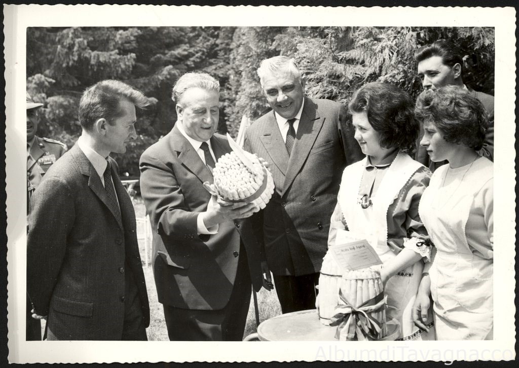 "Mostra degli asparagi" nel parco della Villa Di Prampero. Il presidente della mostra, Zoilo Zanussi, sostiene un mazzo di asparagi premiati sotto lo sguardo di due giovani coltivatrici e del Sindaco di Tavagnacco, Antonio Stella, nel giorno dell'inaugurazione.