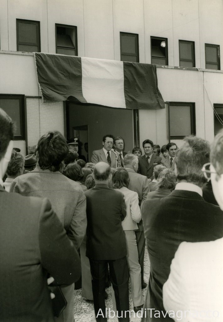 Il Sindaco Giannino Angeli, con a fianco l’Assessore regionale Renato Bertoli e altre autorità, pronuncia il suo discorso in occasione dell’inaugurazione della Palestra di Feletto.