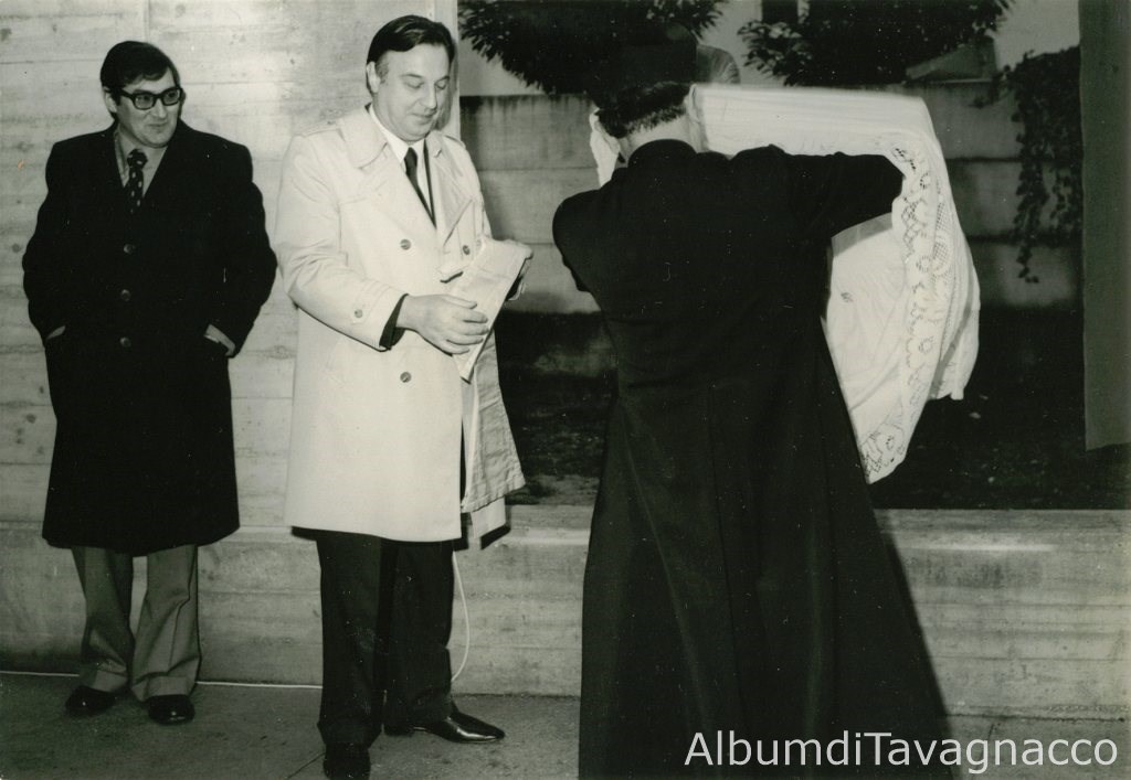 Il Senatore Mario Toros assiste il Parroco di Feletto, Don Nicolò Rossi, a prepararsi per il suo intervento pastorale, in occasione dell’inaugurazione della rete urbana del gas metano, sull’ingresso del Poliambulatorio comunale, in Via Mazzini.