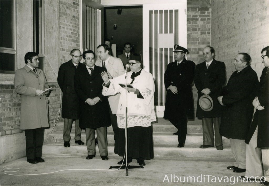 Il Parroco di Feletto, Don Nicolò Rossi, insieme a varie autorità, durante il suo intervento pastorale, in occasione dell’inaugurazione della rete urbana del gas metano, sull’ingresso del Poliambulatorio comunale, in Via Mazzini.