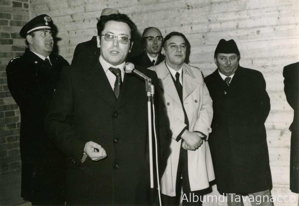 Il Sindaco Giannino Angeli, insieme ad altre autorità, durante il suo discorso per l’inaugurazione della rete urbana del gas metano, sull’ingresso del Poliambulatorio comunale, in Via Mazzini.