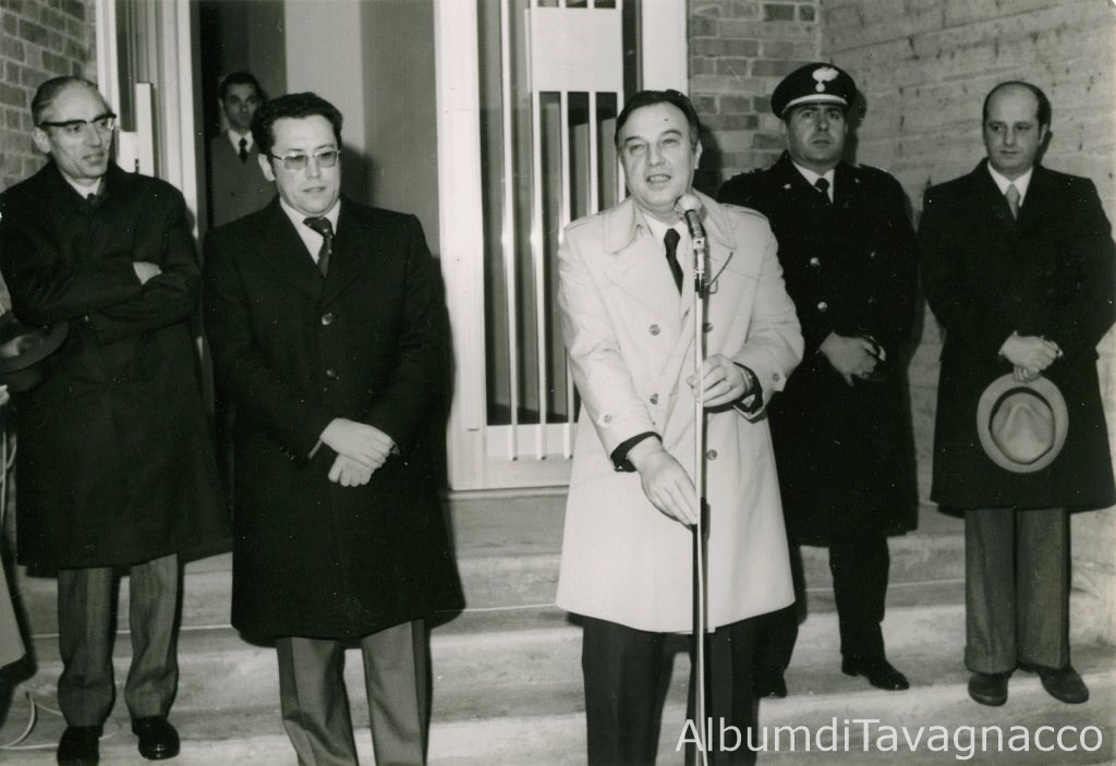 Il Senatore Mario Toros, insieme ad altre autorità, durante il suo discorso per l’inaugurazione della rete urbana del gas metano, sull’ingresso del Poliambulatorio comunale, in Via Mazzini.