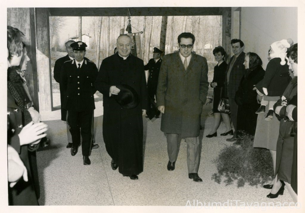 Il Sindaco Giannino Angeli accompagna l’Arcivescovo di Udine, Mons. Giuseppe Zaffonato, all’ingresso della Scuola Materna di Tavagnacco, in Via dell’Asilo, in occasione dell’inaugurazione del nuovo edificio scolastico.