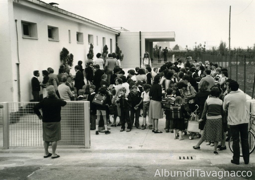 Inaugurazione di nuove aule della Scuola Elementare di Colugna. Assembramento di persone all’esterno della scuola per l’arrivo delle autorità.