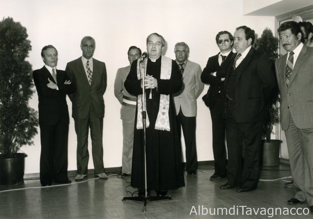 Inaugurazione di nuove aule della Scuola Elementare “Leonardo da Vinci” di Adegliacco. Il Parroco di Adegliacco, Don Gianni Cadario, durante il suo intervento religioso, alla presenza del Sindaco Silvano Tarondo, dell’On. Loris Fortuna e di altre autorità, all’interno della scuola.