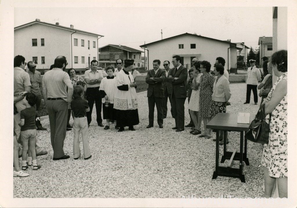 Il Parroco di Feletto, Don Nicolò Rossi, con l’Ing. Monai (IACP) (al centro) e il Sindaco Giannino Angeli, in mezzo a persone e famiglie, in occasione dell’inaugurazione e dell’assegnazione degli alloggi delle case popolari di Via Diocleziano.