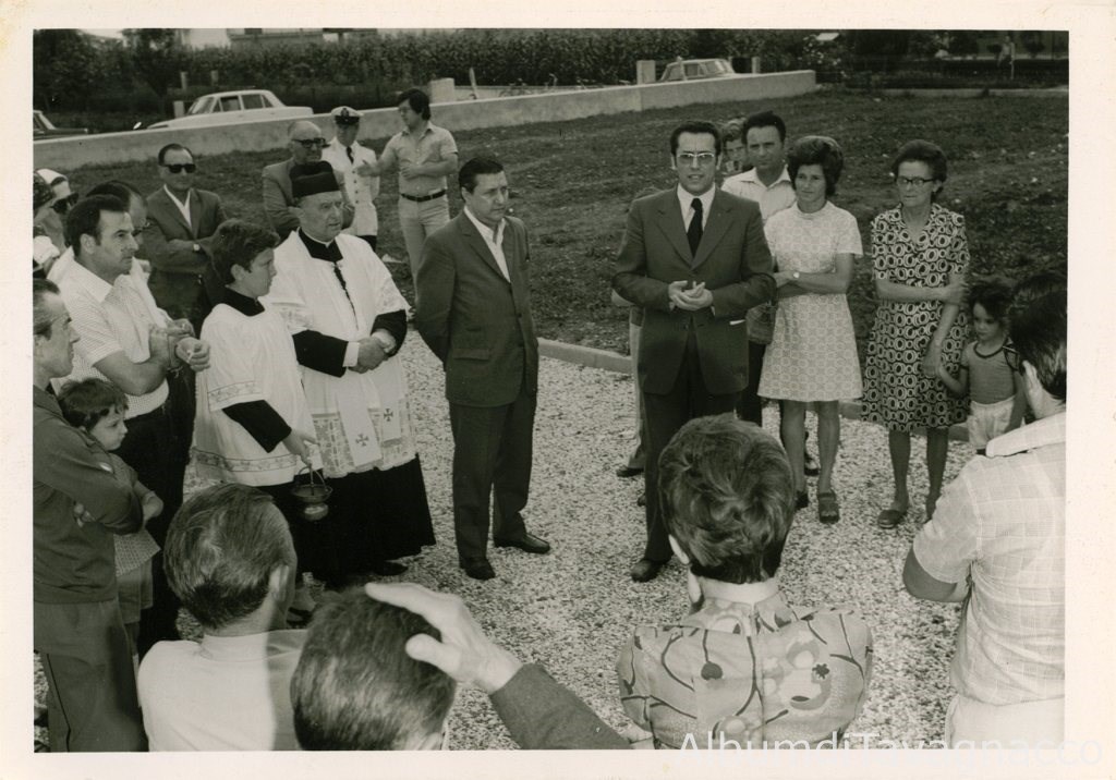 Il Sindaco Giannino Angeli, durante il suo discorso, a fianco dell’Ing. Monai (IACP) e al Parroco di Feletto, Don Nicolò Rossi, in mezzo a persone e famiglie, in occasione dell’inaugurazione e dell’assegnazione degli alloggi delle case popolari di Via Diocleziano.