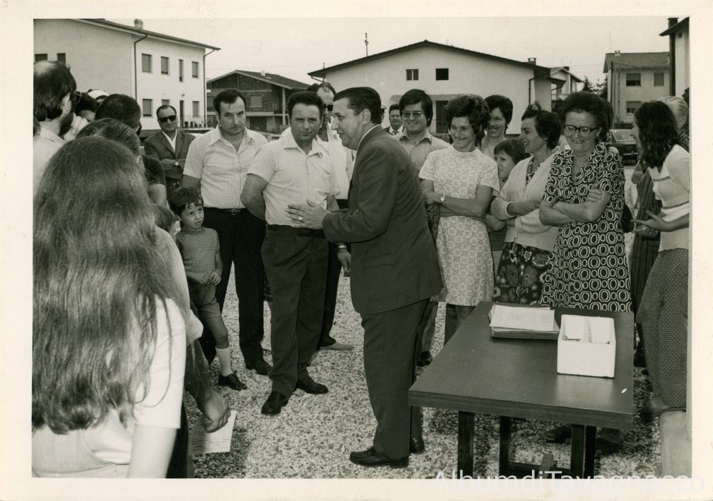 L’Ing. Monai (IACP) (al centro), in mezzo a persone e famiglie, durante il suo intervento prima di consegnare le chiavi degli alloggi ai rispettivi assegnatari, in occasione dell’inaugurazione delle case popolari di Via Diocleziano.