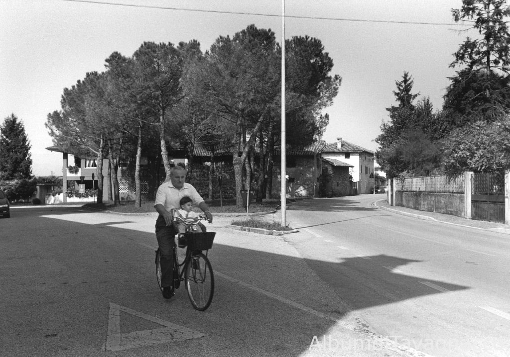Via C. Battisti. - Incrocio. - Via D. Chiesa. - Alberi. - Uomo: anziano. - Bambino. - Bicicletta. - Muretto