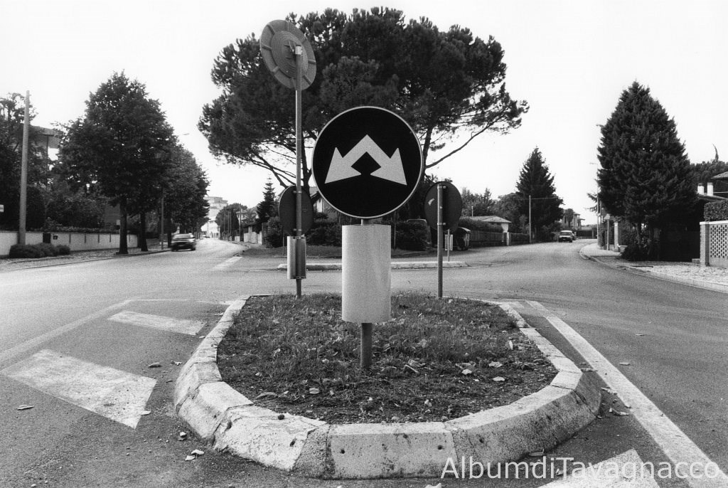 Viale IV Novembre. - Incrocio. - Via XXIV Maggio. - Cartelli stradali. - Aiuola spartitraffico. - Automobili. - Case. - Muretti