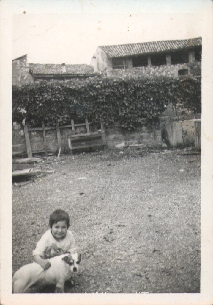 La bambina Agnese Pellarin, all'età apparente di 3 anni, in posa insieme alla cagnetta "Lila", nel cortile di casa Pellarin, in Via Canova 1.