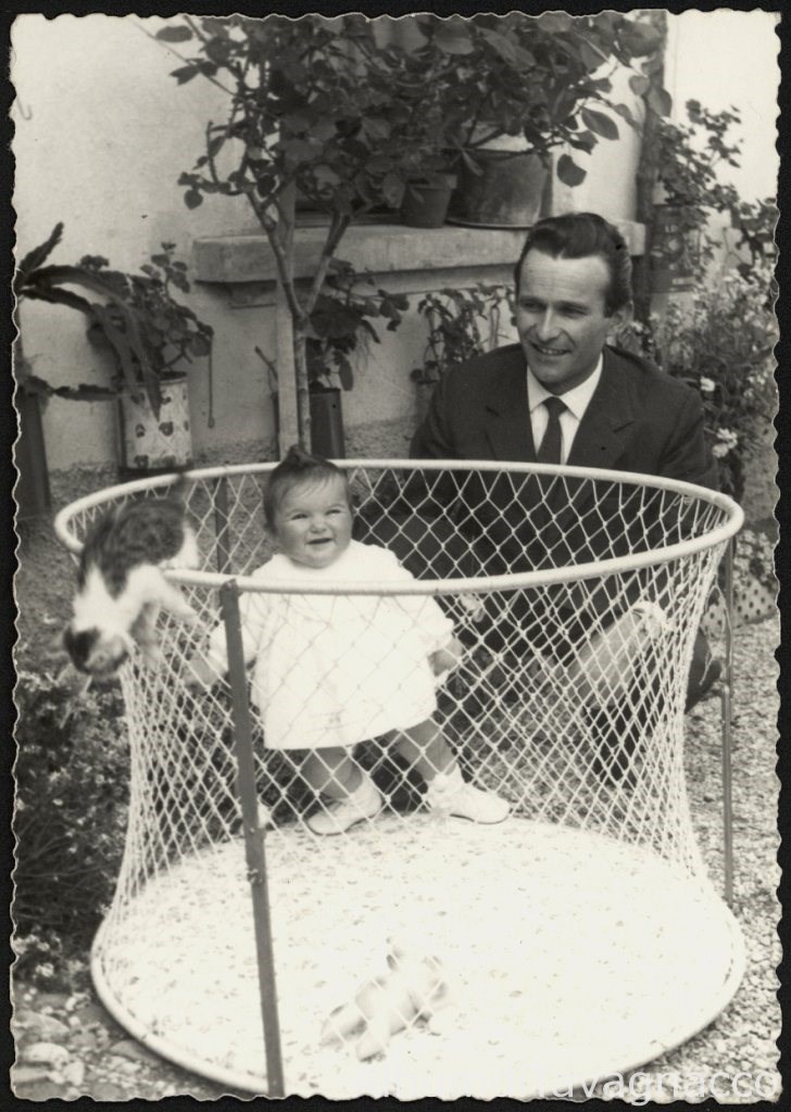 La bambina Fabiola Cornacchini, all'età apparente di ca. 1 anno, in posa all'interno di un box per bambini. Dietro al box, in posizione abbassata, il padre: Lidio Cornacchini.